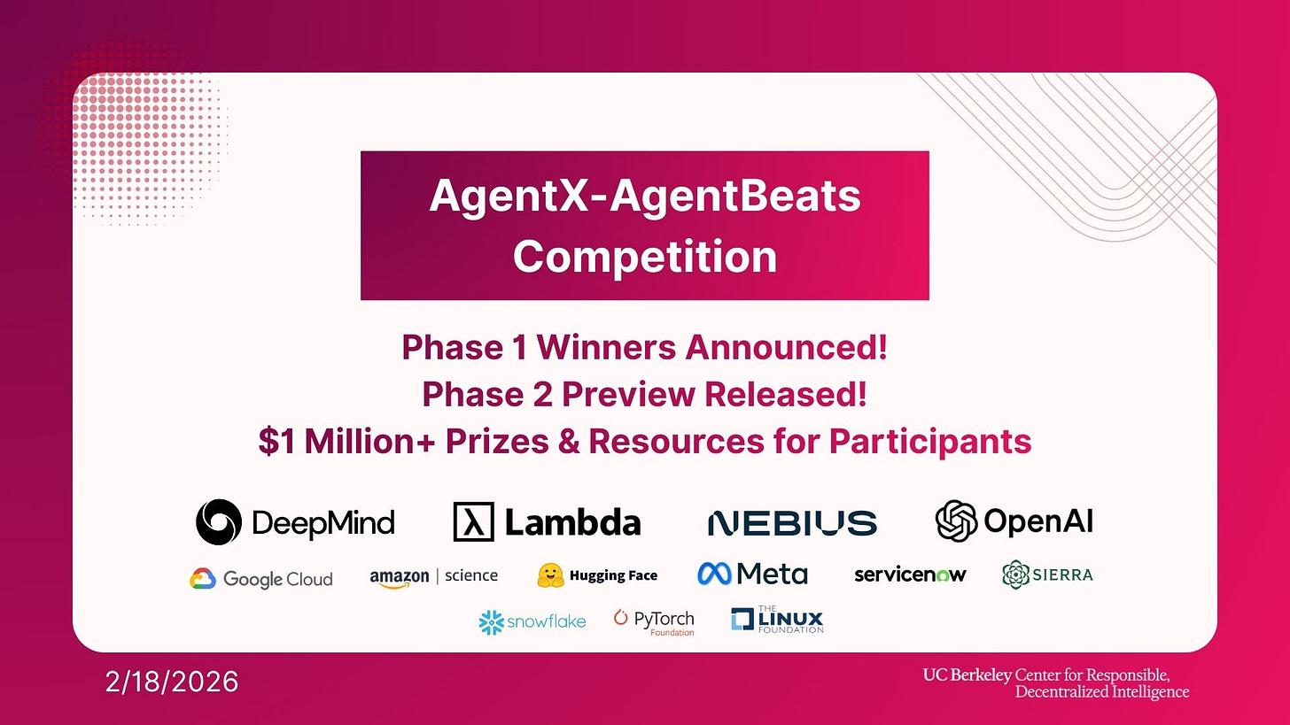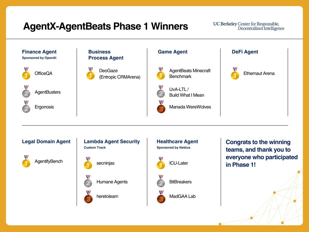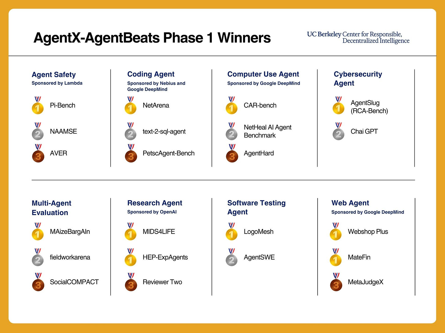 AgentX–AgentBeats Phase 1 Winners, Phase 2 Preview, Berkeley Xcelerator, Agentic AI Summit, new Lambda Custom Track Workshop