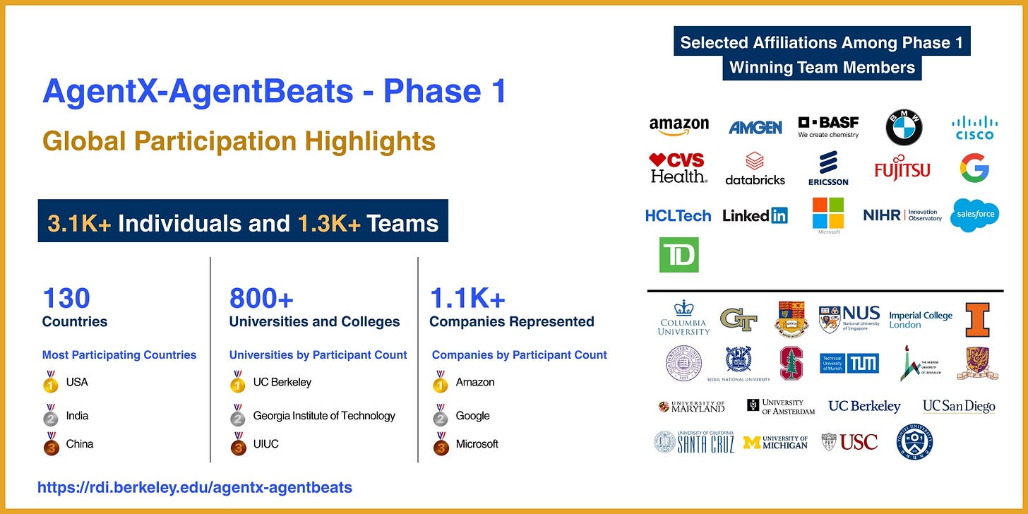 Lastly, we want to sincerely thank all of our Phase 1 participants. This year’s competition has brought together over 3,000 individuals and 1,300 teams, all pushing forward the frontier of Agentic AI. We recently announced some of the incredible statistics from Phase 1 and celebrated our Phase 1 winning teams, as you can see below. We encourage you to spread the word by sharing our posts on LinkedIn and X!